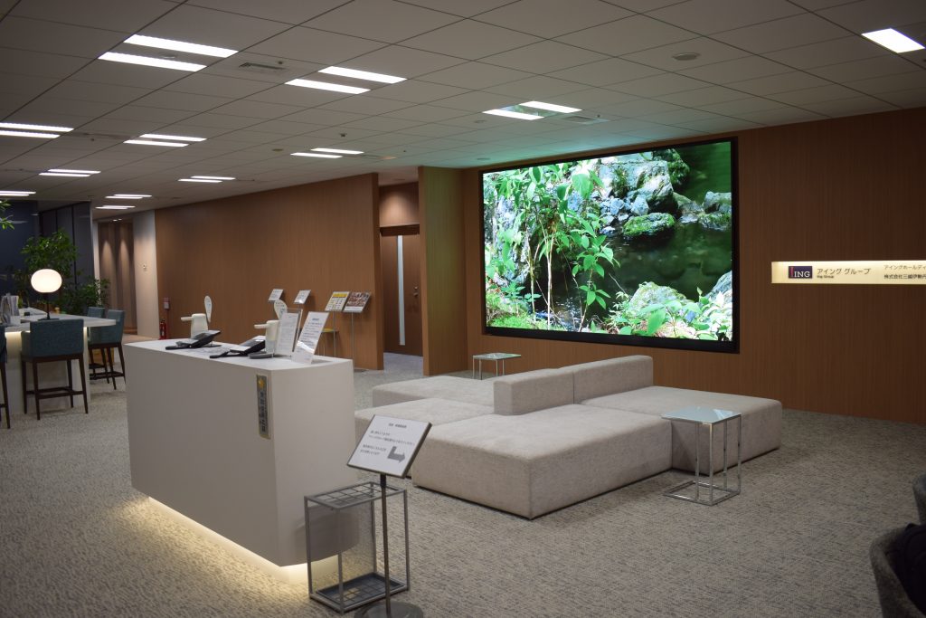アイング株式会社 大手町オフィスのエントランスには、巨大モニターが来訪者の方をお出迎えしていおります。
